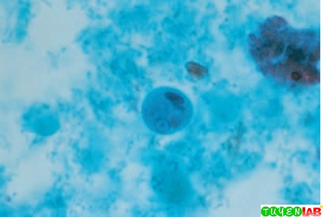 | Fig 13. Blastocystis hominis vacuolar form (trichrome stain). |